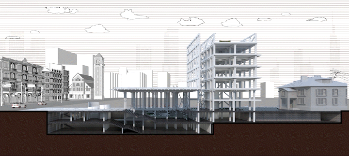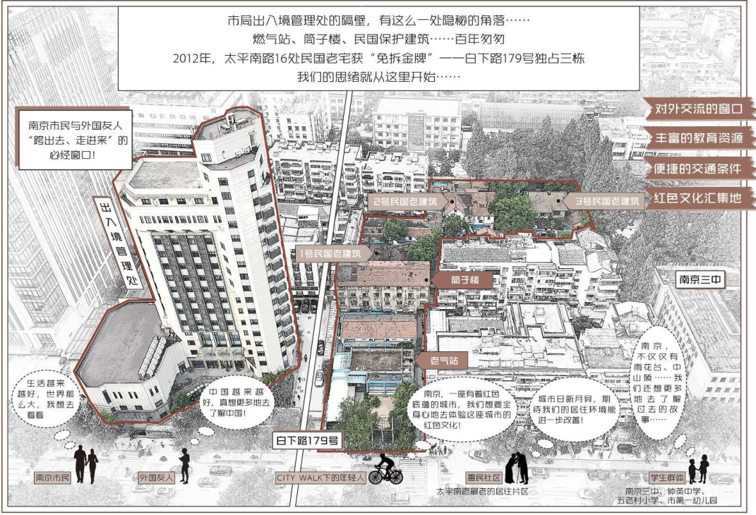 设计基于南京市白下路179号片区的历史与现状,探索其作为民国老建筑、对外交流窗口和红色文化基地的未来新生可能性。方案重新整理了该片区的空间结构与场地条件,以红色文旅、交往社区、数字技术等当代元素编织环境、激发活力,并将周边的市出入境管理处、中南银行旧址、基督圣保罗教堂等建筑、街巷一并纳入流线设计之中,在历史场域中打造了现代、透明、红色、年轻的新空间、新生活,具有一定的实验性。