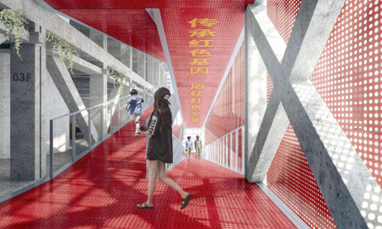 主体建筑筒子楼承担着新老缝合作用。因此,筒子楼选取了外骨骼框架、中置坡道空间的加固改造方案。红色坡道解决了部分疏散问题,并借助投影、LED屏等设备和技术,展示历史文化遗产信息。同时,外骨骼框架的网格化半开放立面,既让坡道参观者得以向外眺望城市,也让城市驻足者得以远观坡道上起伏的人群。