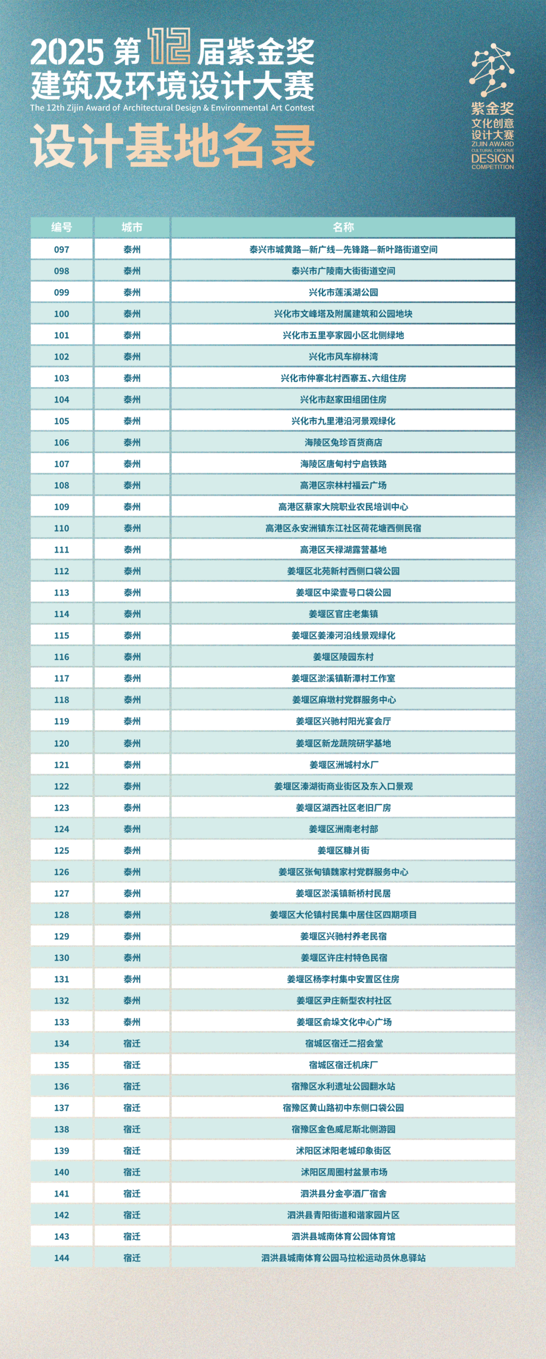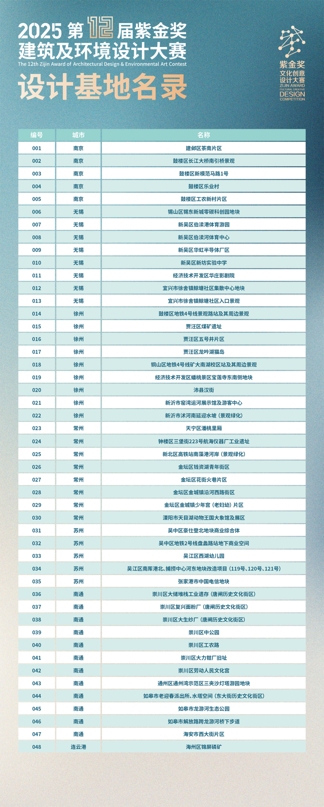 第十二届“紫金奖•建筑及环境设计大赛”共征集到设计基地144个(地方申报138个、社会征集6个),经遴选审核,均符合发布要求。