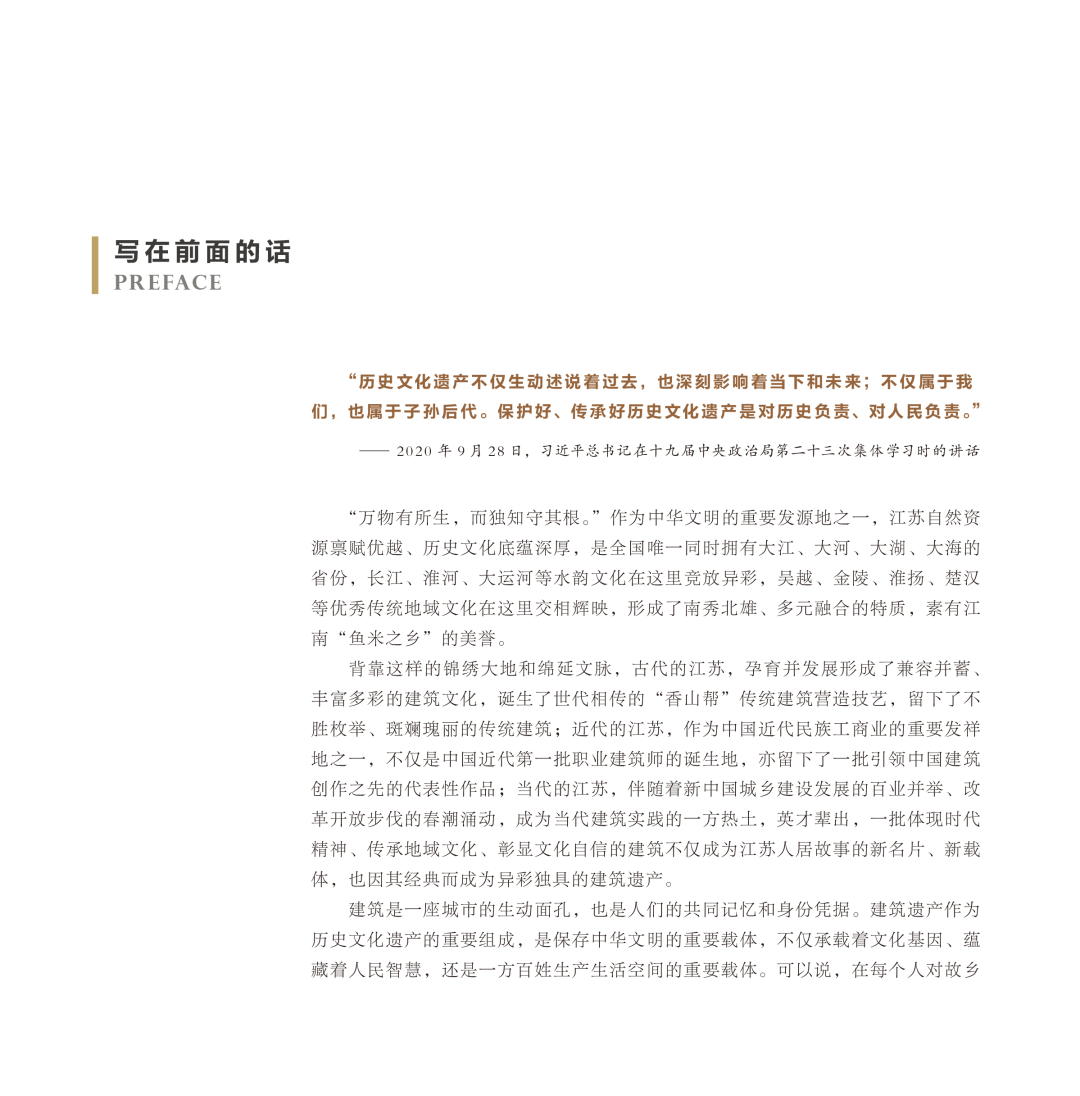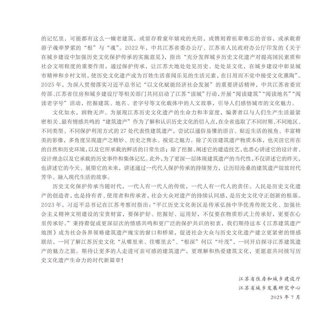 期待你一同了解江苏历史文化“从哪里来、往哪里去”“根深”何以“叶茂”,也期待你在阅读《江苏建筑遗产地图》的过程中,对建筑遗产的价值能够有更深层次的理解,能够从“阅读者”“参观者”成为历史文化遗产的“解读者”“守护者”、历史文化遗产活化利用的“传承者”“推动者”,共同续写历史文化遗产生命力的时代新篇章!