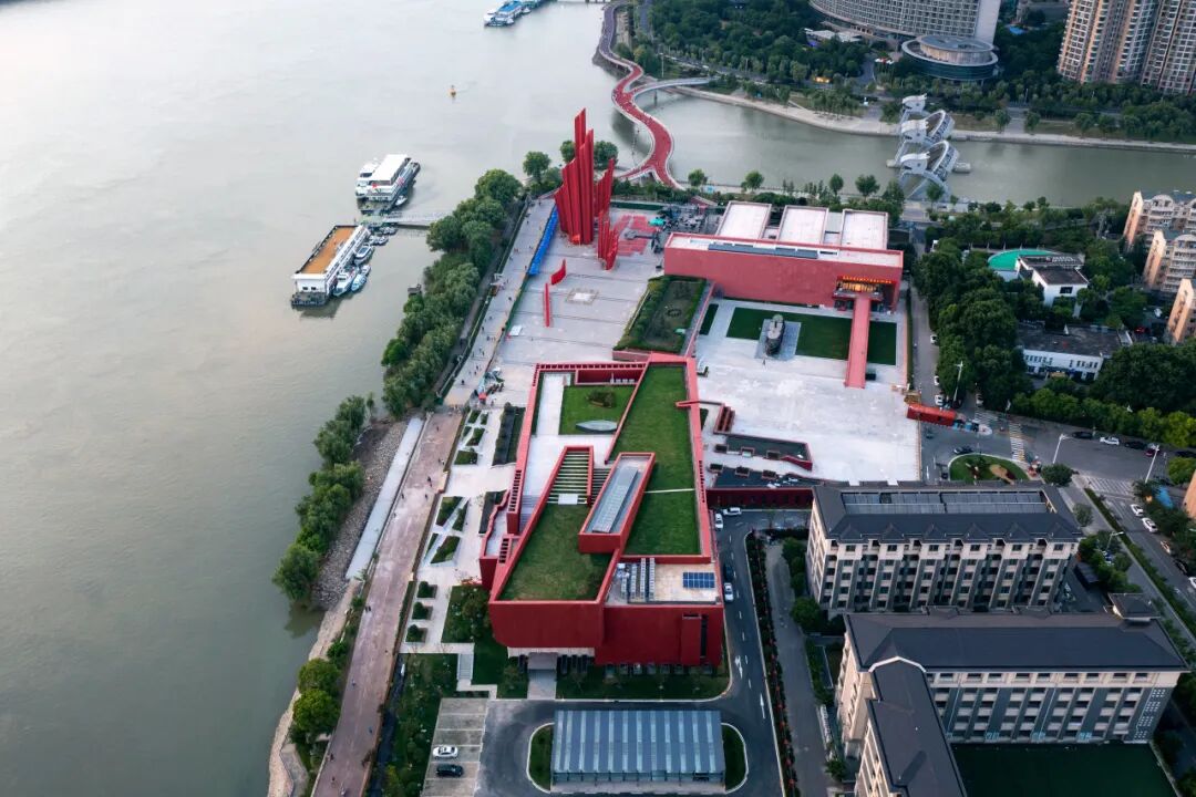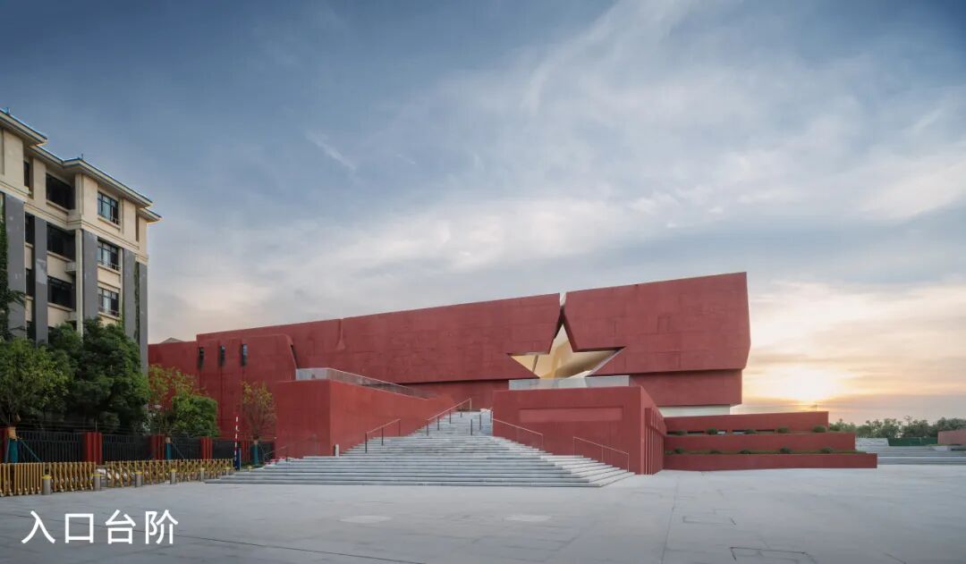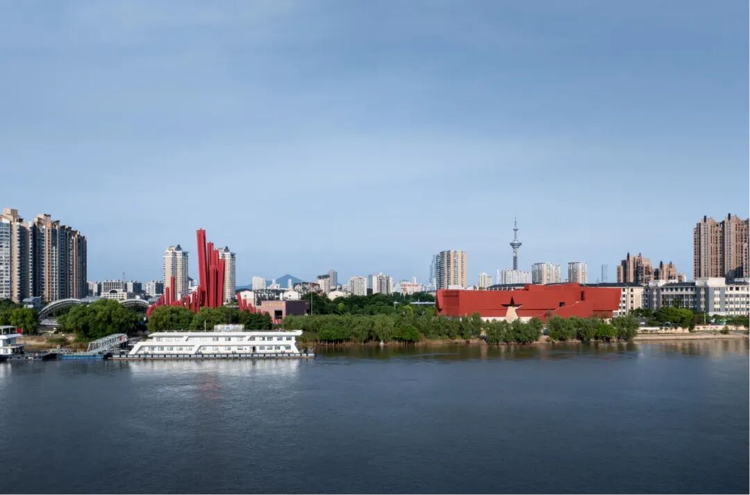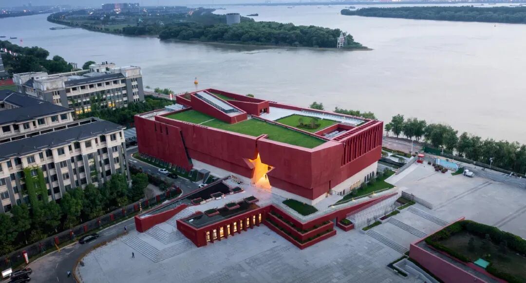 项目设计概念为“复兴之船”——继往开来,世纪领航!从长江一侧看建筑犹如一艘破浪前行、世纪领航的舰船,其空间及形象与渡江胜利纪念馆和胜利广场雕塑群相协调,又具有时代差异性。建筑立面立体红色五角星,外墙带肌理的GRC板材使得建筑更加庄重、浑厚,成为镌刻着红色记忆的地标。