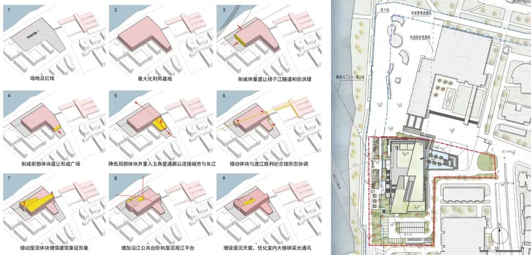 建筑总体布局最大化利用了基地内有限的可建设面积,建筑肌理与周边渡江胜利纪念馆、树人中学保持协调,建筑体量避让了隧道和河堤,突出建筑形象特色。