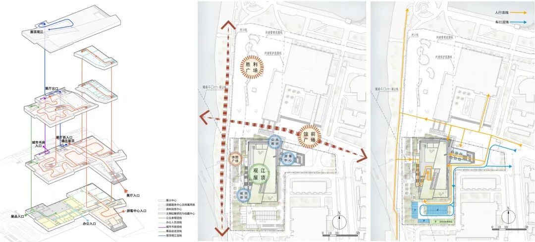 建筑内部功能分区明确,各功能区流线独立设置,相互联系又互不影响。建筑总平面功能流线结合周边建筑及城市交通条件进行合理组织,场地功能结构与馆前广场、胜利广场统合为一个整体。人行流线有机衔接城市道路与滨江步行系统,基地内人车严格分流。