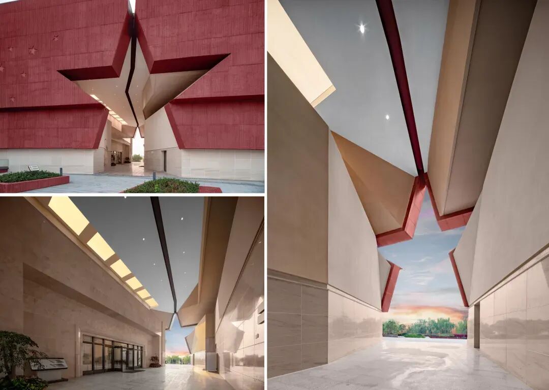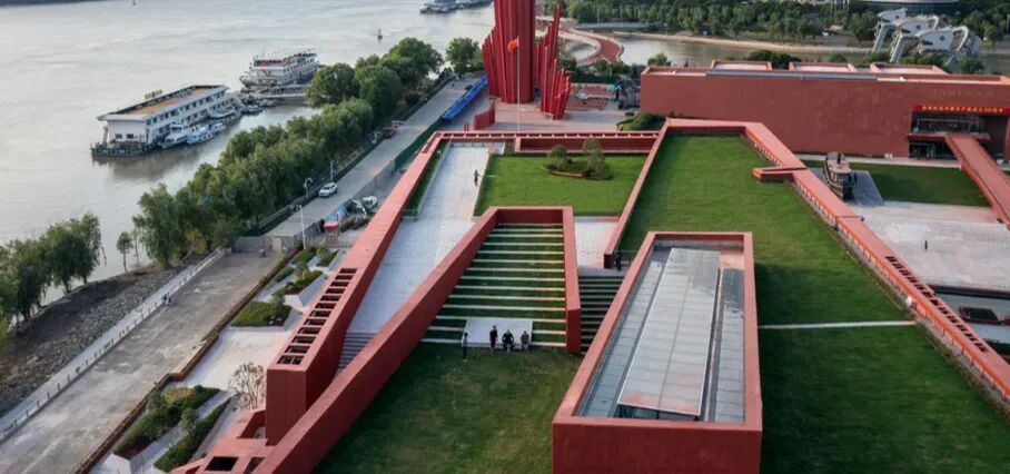 建筑空间有机嵌入所在地的城市文脉,整个参观流线是一条穿梭于历史与现代,穿梭于城市广场、红色展厅和滨江景观的连续时空叙事路径。五角星纪念形象将大众从广场吸引至建筑入口大台阶,拾级而上经过屋顶水池平台到达五角星通廊,参观体验也从室外过渡到半室外转而进入室内展厅。参观者将追随中国共产党在南京的壮丽历史,经由洒满阳光的室内楼梯,进入三层展区。走出展厅,便可沿台阶到达屋顶平台,可全览长江盛景。
