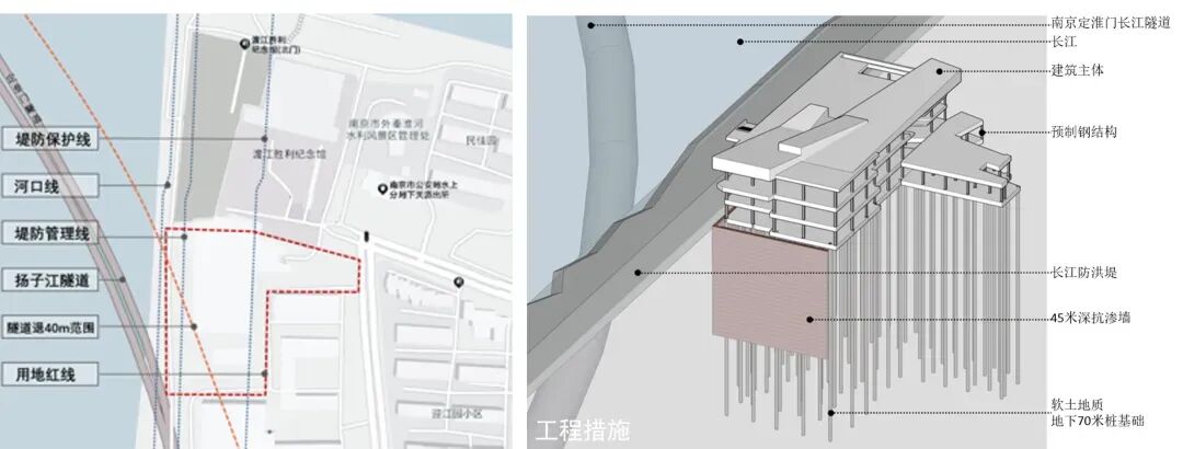 基地紧邻南京定淮门长江隧道和紧靠长江防洪堤,用地范围为L形。为了有效利用地形且避免地下水位高及项目施工对旁边隧道带来的不利影响,项目不设地下室,并采取在滨江一侧设45米深抗渗墙、采用桩基(无基坑开挖)、全过程风险监控等安全措施。建筑结构主体采用钢结构体系,填充墙采用ALC板、外墙饰面采用干挂GRC预制板等,提高建筑的工业化生产及施工效率。