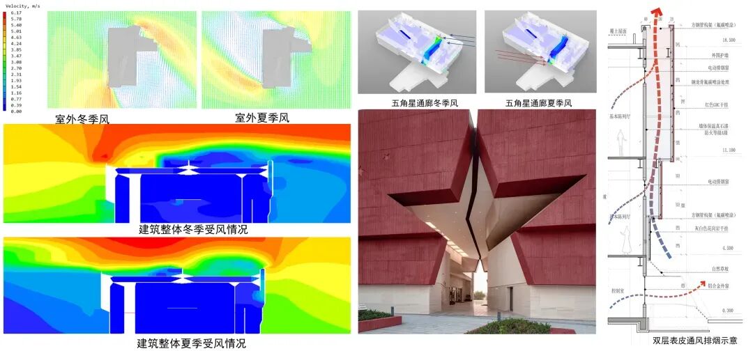 考虑到展览建筑对室内自然通风的需求量不大,建筑的双层表皮既满足了非展览空间的通风需求,又避免了风速对展厅的不利影响。五角星通廊在发挥冷巷效应,满足综合大厅和信息查阅中心用房通风的同时,其洞口方向东侧向北转折和西侧向南转折,减小了夏季东南风和冬季西北风的直接贯通。