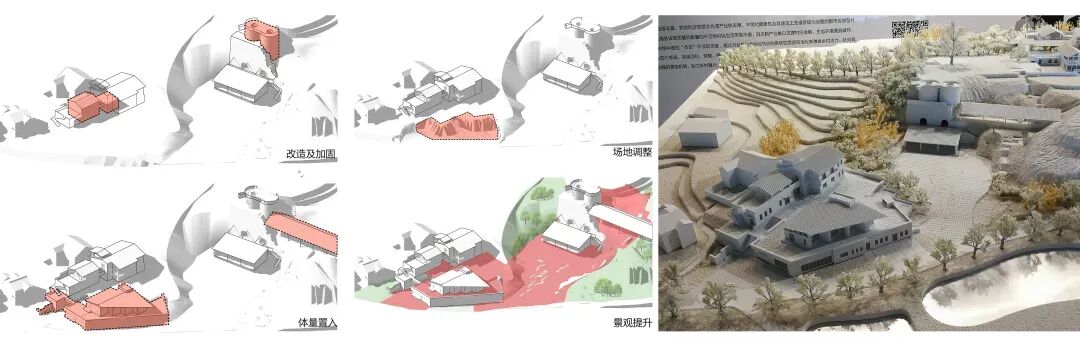 在生态层面,项目通过坡体加固、水系疏导与废弃材料循环利用推进环境修复。建筑采用半覆土形态契合地形,减少土方扰动,并借天井拔风、种植屋面与太阳能集热等乡土技术实现节能降耗。