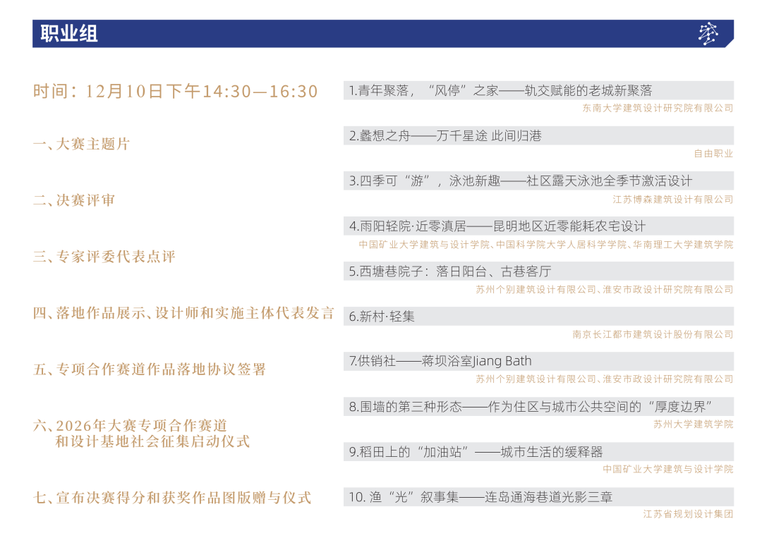 由中共江苏省委宣传部、江苏省住房和城乡建设厅联合中国建筑学会、中国勘察设计协会和中国风景园林学会共同举办的第十二届“紫金奖·建筑及环境设计大赛”,经作品征集、专业评审和社会公示,共有20项作品入围电视决赛。决赛于12月10日(周三)在南京举办。