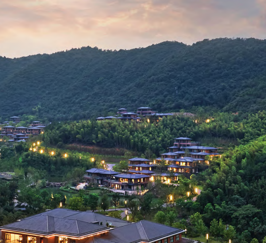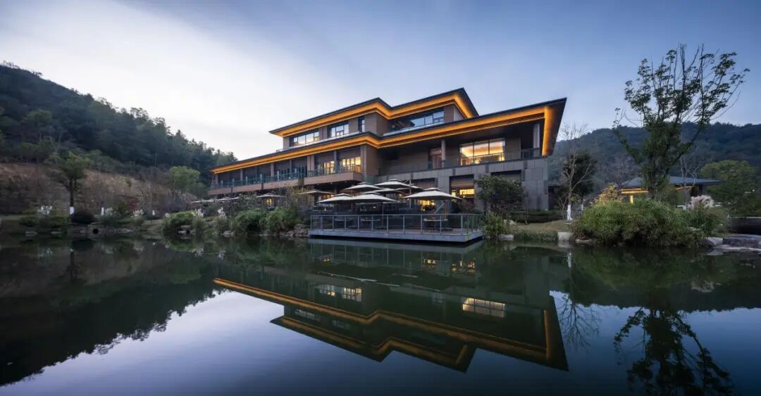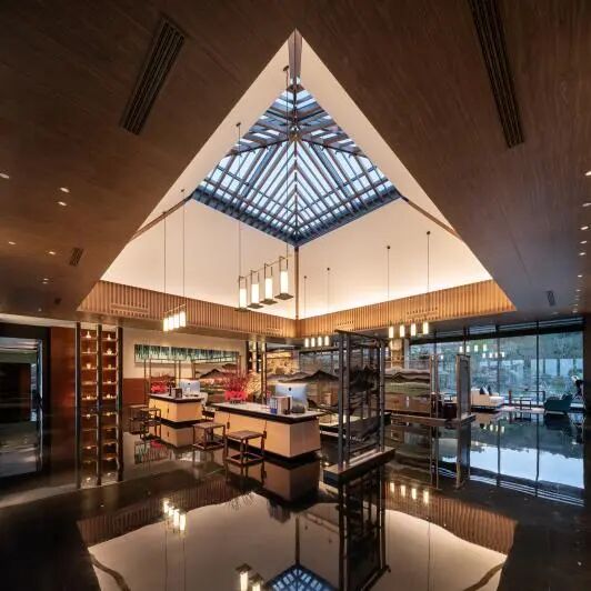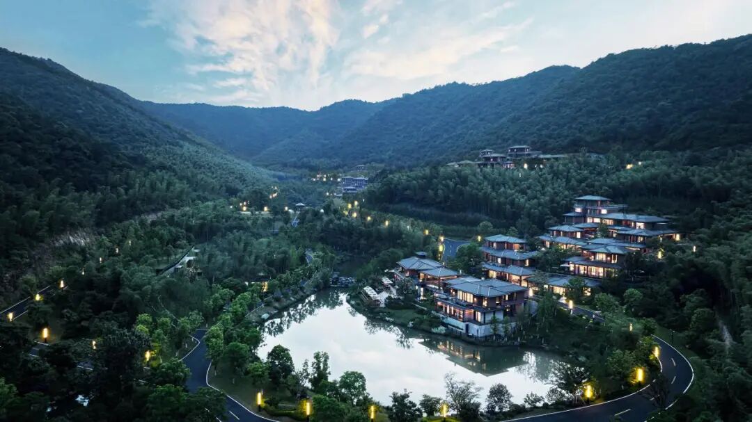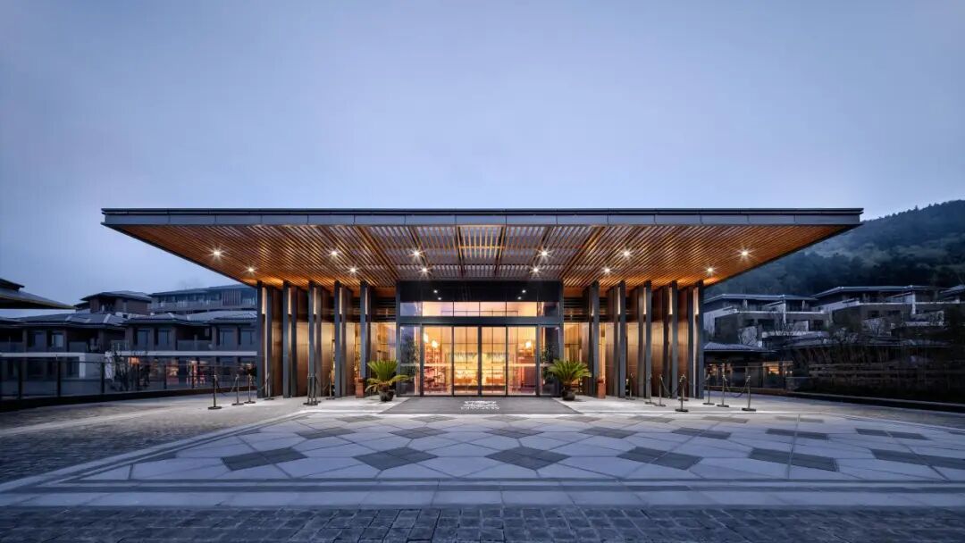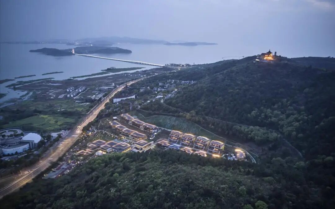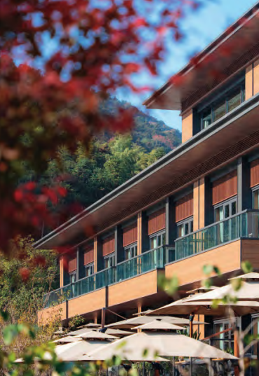 宜兴西岸凰川酒店选址于大凰川十亩原始山谷,基地呈东西向狭长形态,四面环山,南侧分布三处跌落水系。设计并未选择集中式布局,而是基于对丁蜀古镇传统街巷肌理的研究,将建筑功能解构为5个村落组团,顺应地形呈“散点聚落式”形态嵌入山谷。这种布局提升了建筑与山体的融合度,并通过1680米的竹林小径与木栈道串联起“隐于山林、步移景异”的空间序列。