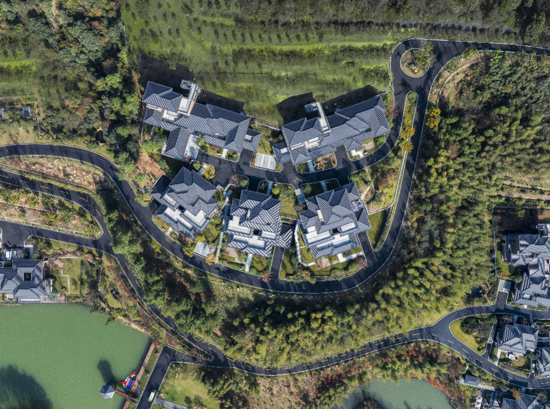 相似的山地挑战也出现在苏州太湖丁家坞精品酒店项目中。项目位于渔洋山风景区,地形陡峭、地块狭长。设计同样选择“传统聚落的自然布局”,建筑依山而建、层层叠起,通过保留场地内高大乔木与原生溪流,让建筑如同植物般“落地生根”。丁家坞酒店通过建筑朝向的修正和对自然的谦逊姿态,让建筑成为了“环境友好型”的存在。