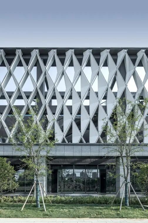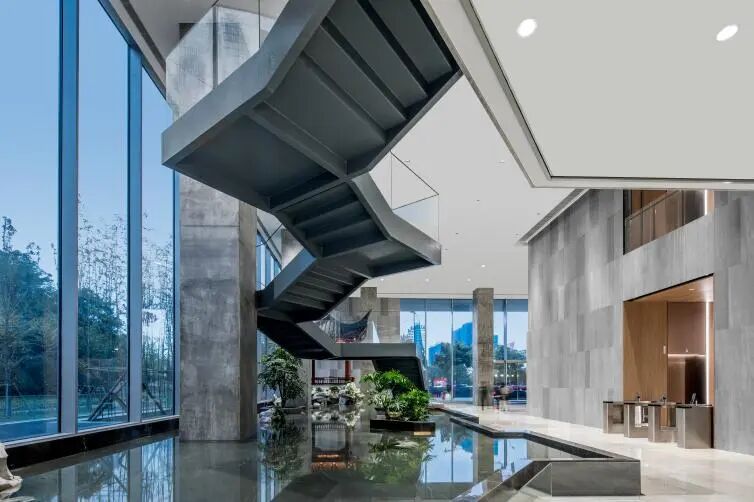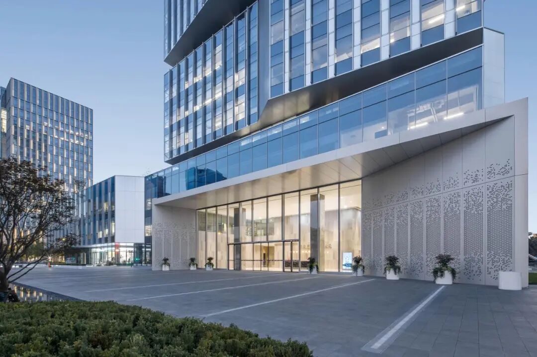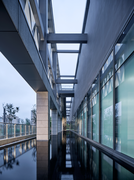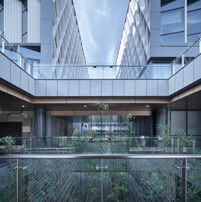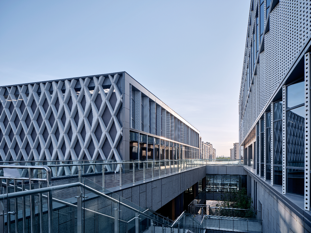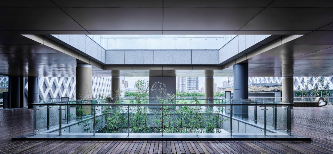 十年后,新建的旺茂街9号启迪设计大厦,将这份理念又从不同的维度进行了呈现。这座百米高的绿色三星、LEED金奖建筑,以“垂直庭院”重构苏州园林意境,空中花园让员工在百米高空触摸自然,曲桥般的楼梯复刻着移步换景的园林精髓。二层通高玻璃墙践行“借景”之道,将室外景致引入室内;入口金属雕花面板在夜间亮起,如传统花窗般流淌着古雅韵味。