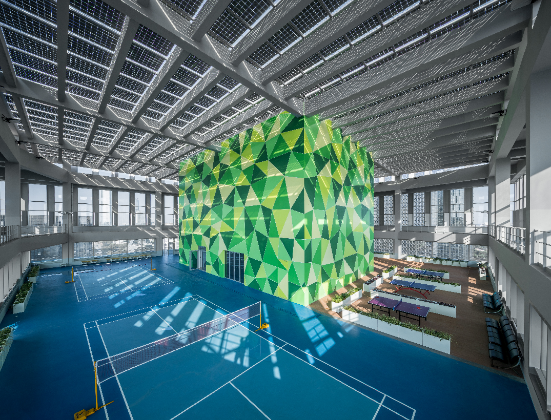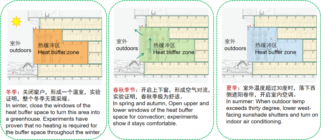 绿色设计依托全专业、全过程的协同整合。通过计算机模拟,建筑以“南低北高”布局与东北向塔楼位置,获取最大化光照;建筑形体自遮阳与立面垂直遮阳板结合,减少了42%的太阳辐射。热缓冲空间的智能调控效果十分有效:冬季关窗成温室无需供暖,春秋开窗促进对流,夏季联动遮阳与空调,一年可节省75%的空调能耗。屋顶与墙体的太阳能板,也成为建筑美学的一部分。