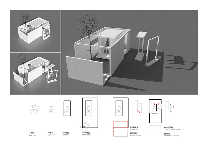 利用不同的场景,在最小的范围内,最少的建构物,完成一次空间转换。实现一个人,一张桌,一本书,一个世界。