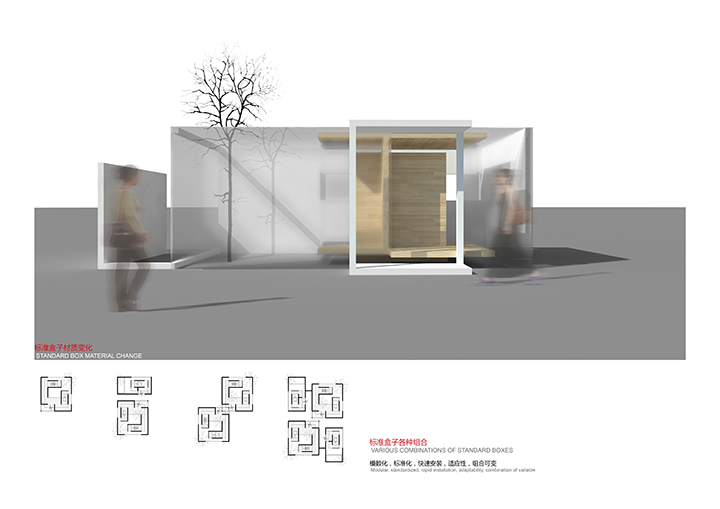 构思源于俄罗斯套娃+苏州园林,通过套叠与渗透实现空间的快速转换;围合界面(透明度,材质感)的变化组合可以营造不同的场景趣味。