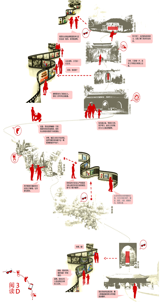 为景区设计的3D阅读就是应用的高科技视觉效果眼镜,用卡通的表现方式帮助游客看到在景点发生的历史故事,了解景点背后的文化由来。同时,通过指纹触摸和声音感应也会使相应的文字介绍出现,也可以激起游客的好奇心和兴趣。总的来说,3D阅读是通过虚构阅读的方式来增加人们对历史景区的兴趣,从而加强历史文化的传播。