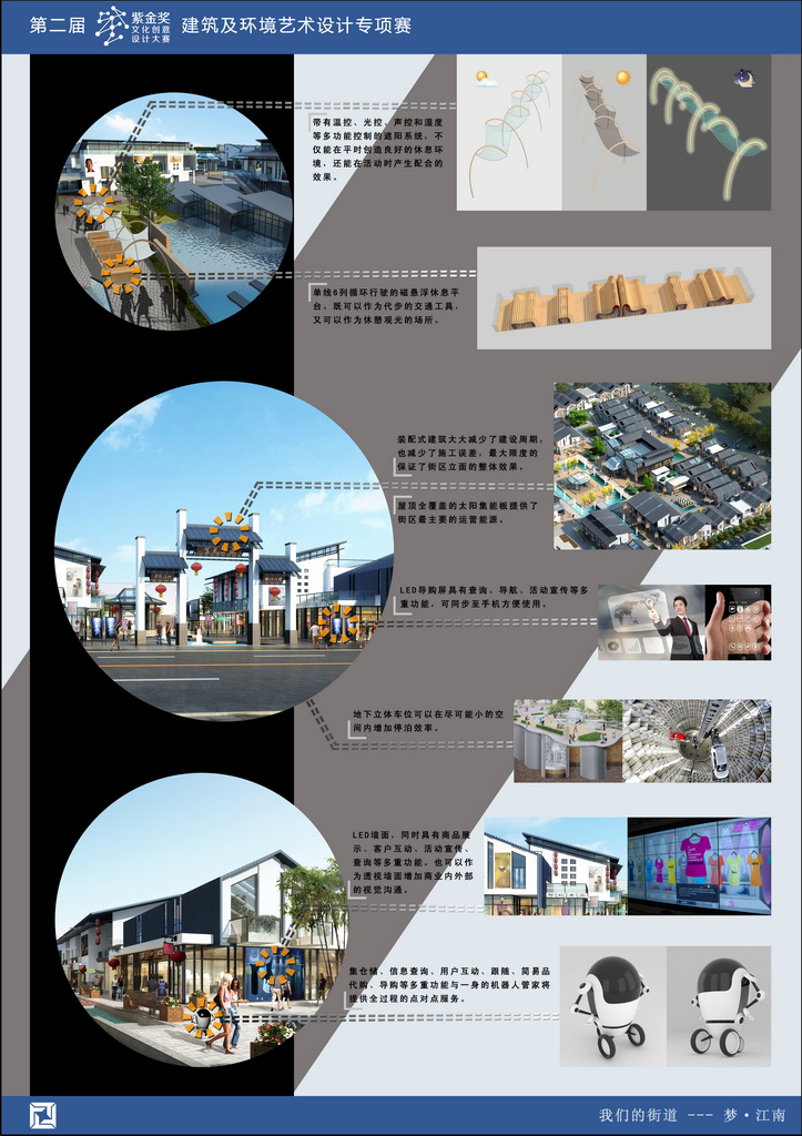 1.未来城市应该是什么样的? 商业区,城市的重要组成部分,人们互动交流的的中心,体现着城市的文化,经济的繁荣。未来的商业街应该是什么样的?我们的设想是融入了江南水乡文化气息的渐进式的变革,延续着中国传统文化的代代传承。不断提升的个性化、科技化服务让人们在感受文化的同时,体验科技带来的便利。