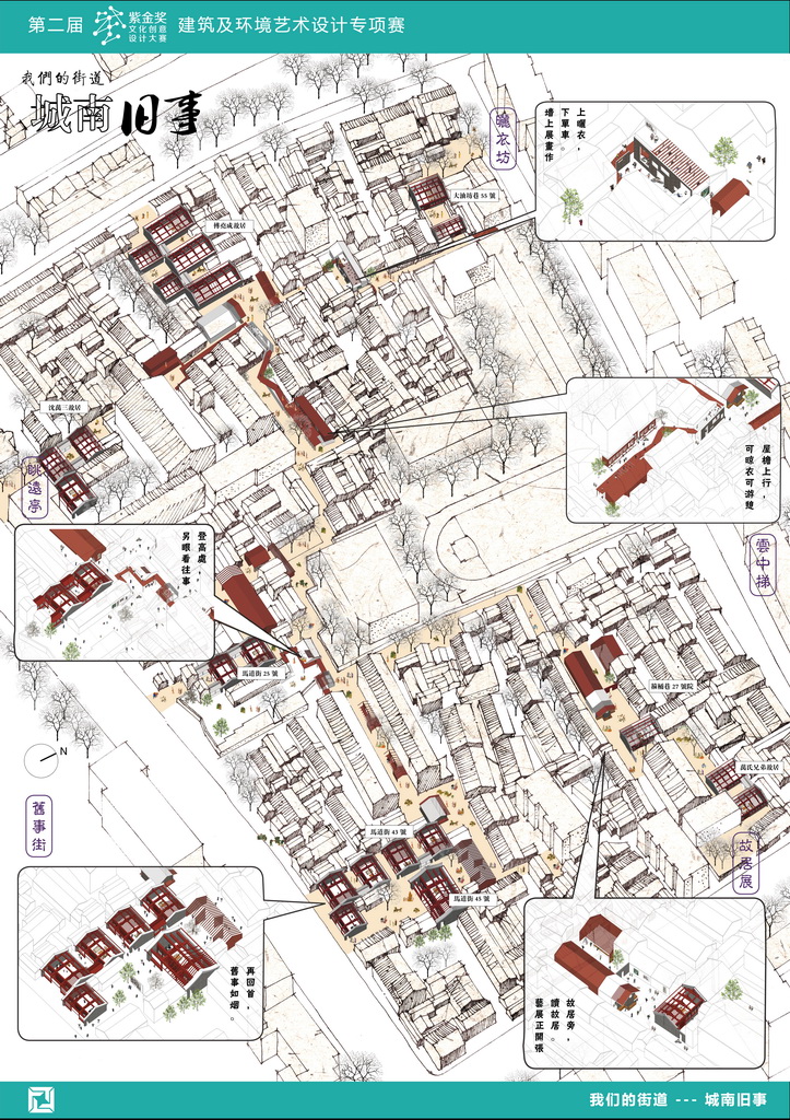 该作品是传统街区创意设计的优秀案例,通过空间结构梳理,利用转角,缝隙等空间,组织公共交互空间,创新空间形态。特别是采用手绘设计表达,更值得我们宏扬。