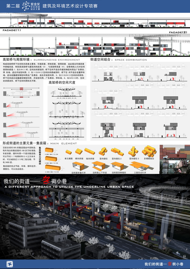 因为高架桥的出现主要是为了解决交通问题,所以大部分的高桥都设置在城市中间,贯穿在居住空间中。它破坏了原来的街道体系,我们希望利用高架桥下浪费的空间,恢复街道的作用,打破传统街道的形式,让“人”在水泥的森林中可以增进交流。