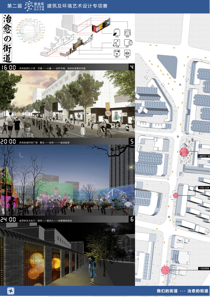 我们在南京市区内选取了六种类型的街道节点,涵盖了新建建筑、改造建筑,街道空间、广场空间,将这些节点类型分别对应不同的时间和人群,在不同的时间段、面对不同使用者的需要,这种交互界面呈现出多样的功能。它可以模拟场景、显示信息、实时监控、远程互联、智能感应。