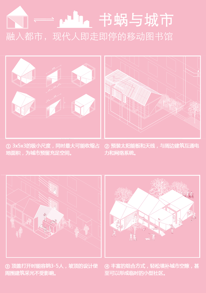 通过手机app搜索附近的书蜗,即用即租,用app操作屋顶开合,带来开放和封闭两种空间体验。内部家具集合多种功能,粉色使其更具标志性,也带来平静的氛围。除去实体书,书蜗亦与各大文库合作,在建筑附近可以通过WIFI免费获得正版电子书。