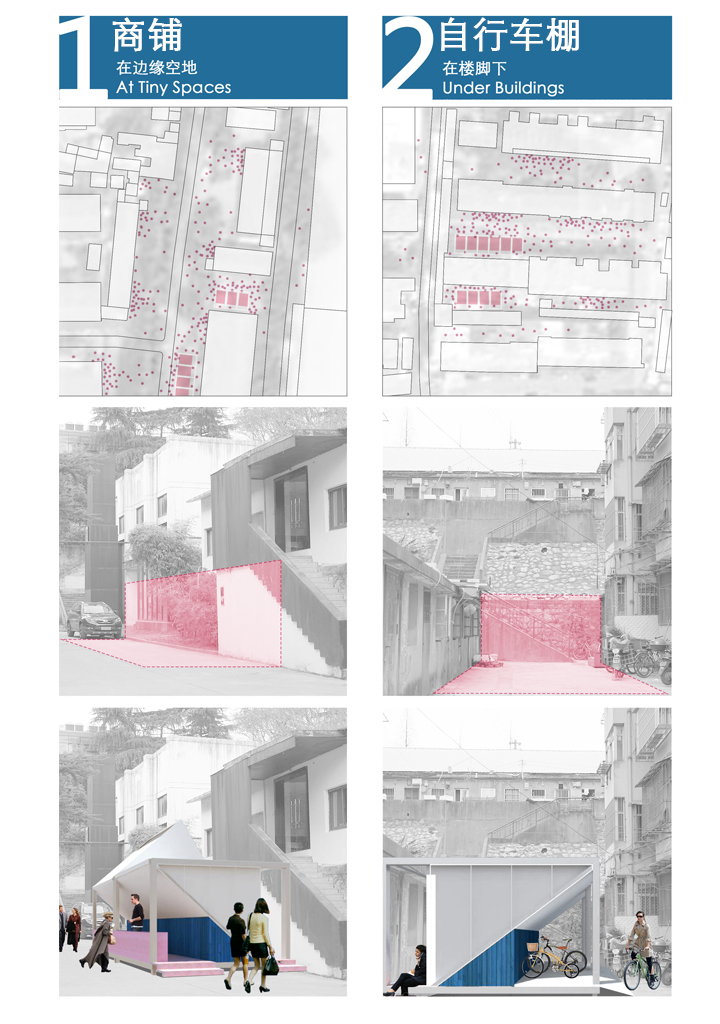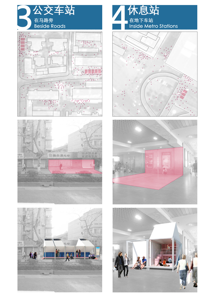大部分底部空间还给城市,占地面积极小,却可容纳3-5人。坡屋顶的设计减少对周边建筑影响。底部空间可替代城市原有设施,如公交车站、自行车棚等。极小尺寸、底部架空、组合丰富使它能够融入城市,符合现代人碎片化阅读的习惯。