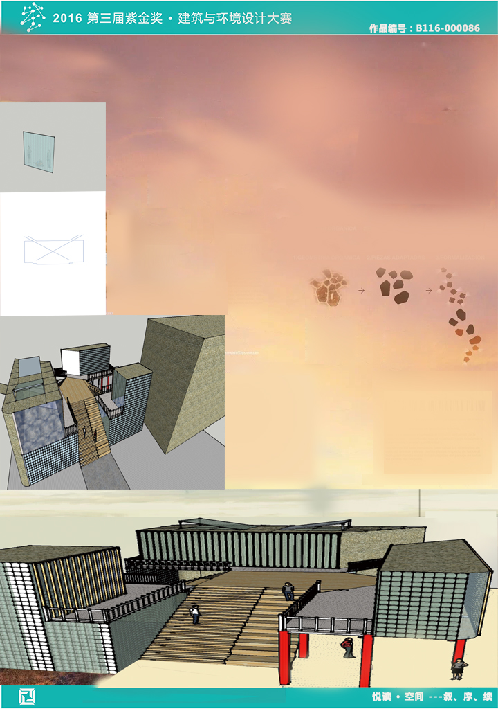 叙.作为设计师我们用建筑语言向读者叙述江汉路的过去,现在和未来,同时引入第二作者,我们给定体块梁板柱,让商家和居民自己用自己的建筑语言去叙述自己的文化和个性。序,我们引入城市微空间将不同类型的人群有序的处理在一个混乱和嘈杂的产地中,使场地有序化,让购物者能感受到悦读的愉悦。续.我们发现在街道的尽端广场,却鲜有人经过,看到尽端广场两侧商铺的门前冷落,与周围的热闹气氛显得格格不入,于是,我们选择了这一面积不大却一直未被利用的一片天地,我们的目的就是激活这一小天地的活力,在这里创造一个充满活力和自由的阅读空间,创造出适应当今人们的生活方式,同时具有多样性,个性化,人性化的新型阅读空间。